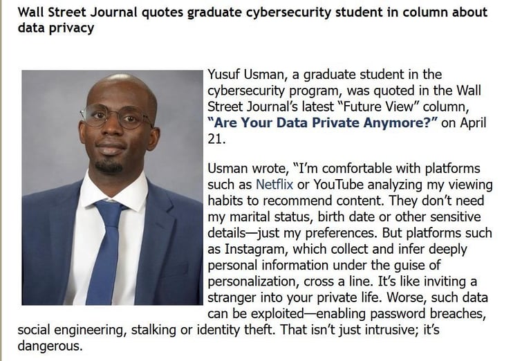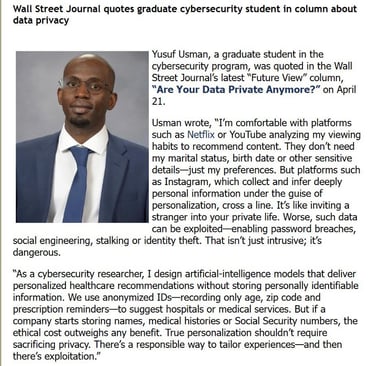 Read moreWall Street Journal quotes graduate cybersecurity student in column about data privacy title: Are Your Data Private Anymore? April 2025