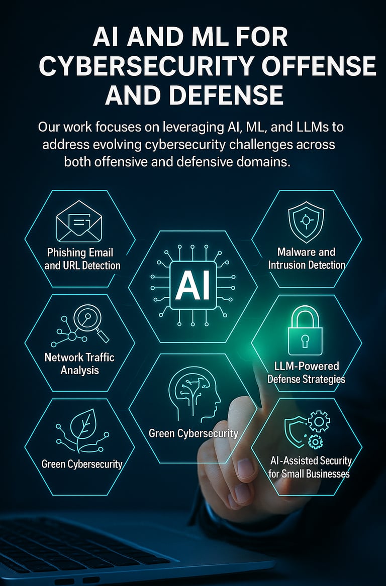 Our research explores the use of AI, ML, and large language models (LLMs) to tackle emerging cybersecurity threats across both offensive and defensive fronts. Ongoing initiatives include